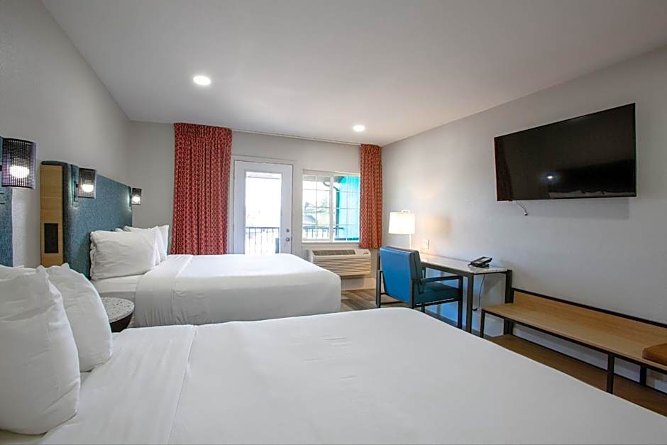 Welcome to our spacious Courtyard Queen Room with Two Queen Beds. This family-friendly room features comfortable accommodations for up to 4 adults and 2 children, along with a private bathroom, bathtub, and a variety of convenient amenities such as a microwave, coffee machine, and flat-screen TV. Enjoy the view of the pool or inner courtyard from your patio, and relax in the comfort of air conditioning and hardwood floors.